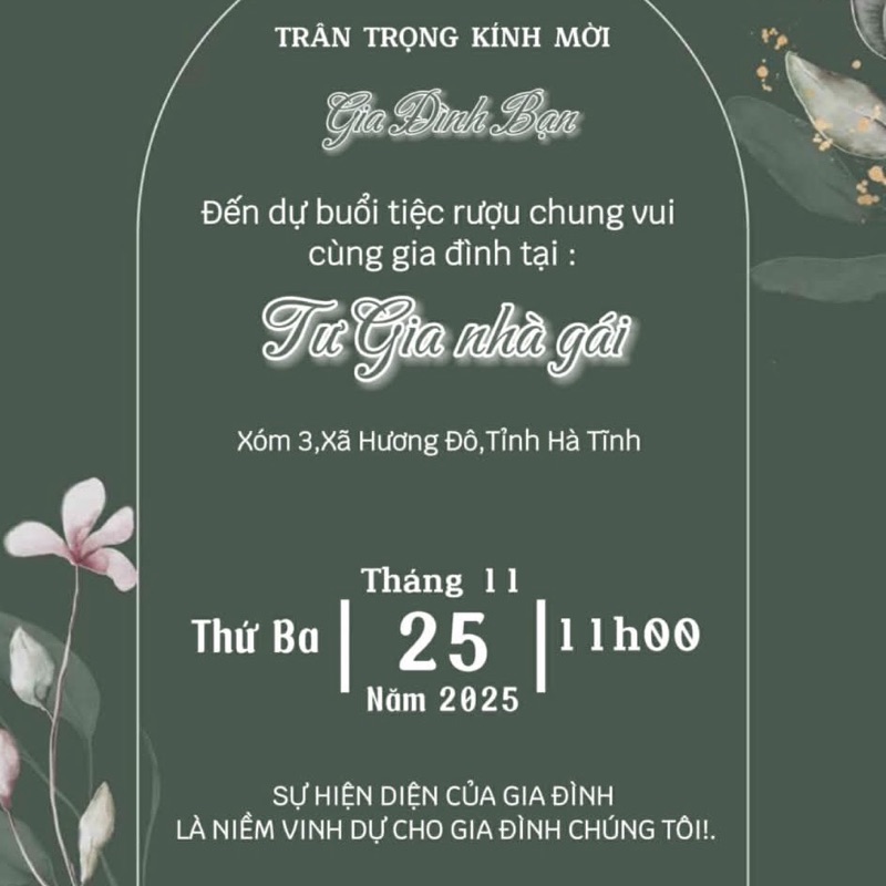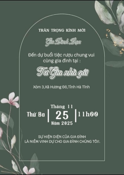 Chúng tôi sắp bước sang một hành trình mới - hành trình của gia đình nhỏ. Rất mong được đón tiếp bạn trong ngày đặc biệt này để cùng tạo nên những kỷ niệm đáng nhớ!